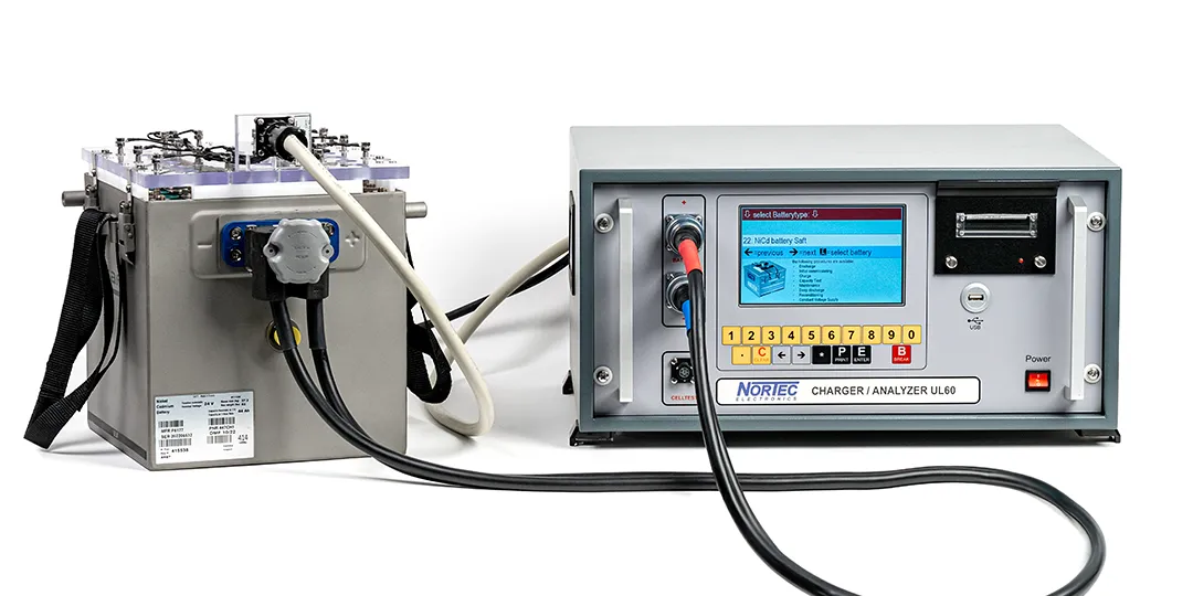 The networkable UL60 is a charging, discharging and maintenance device for the professional capacity measurement of aircraft, rail and UPS batteries. Rechargeable NiCd, lead and lithium batteries can be optimally maintained with individual programs.
